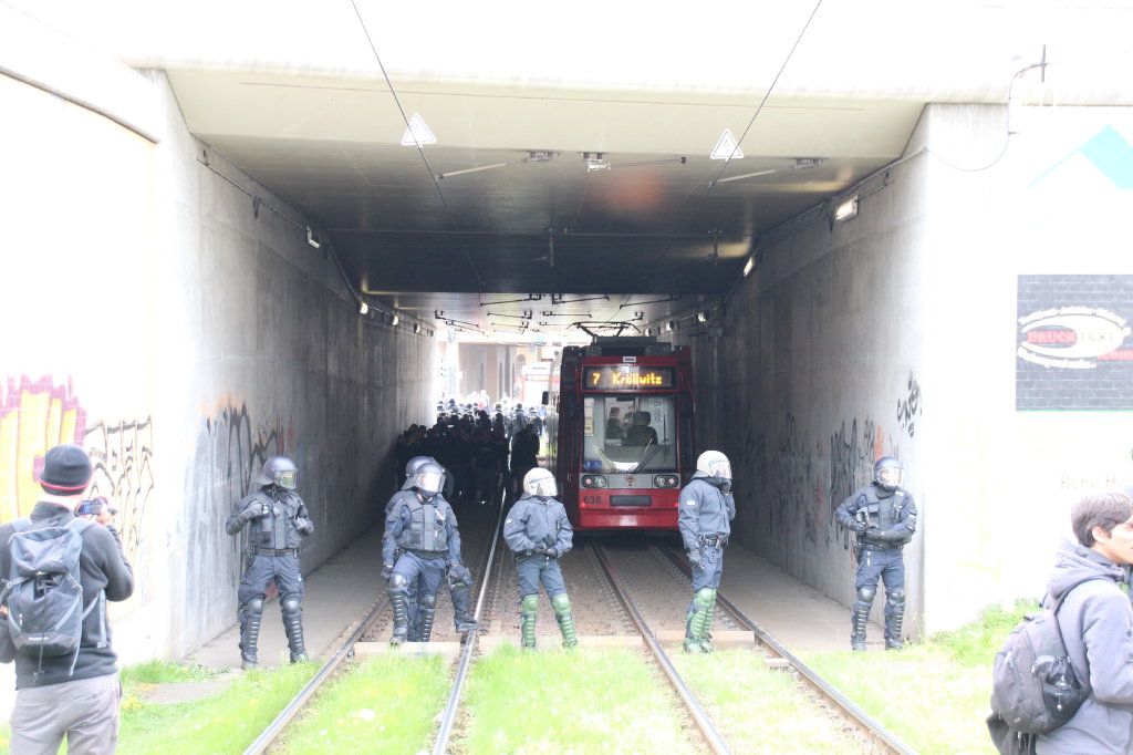 - Im Straßenbahntunnel am Genscherplatz sind kurzzeitig mehrere Rechtsextreme von der Polizei abgeriegelt worden.